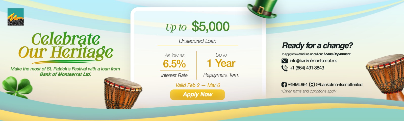St Patrick’s Festival Loan Celebrate St Patrick’s Festival with confidence. The Bank of Montserrat is offering a special short-term loan to help you cover festival-related expe